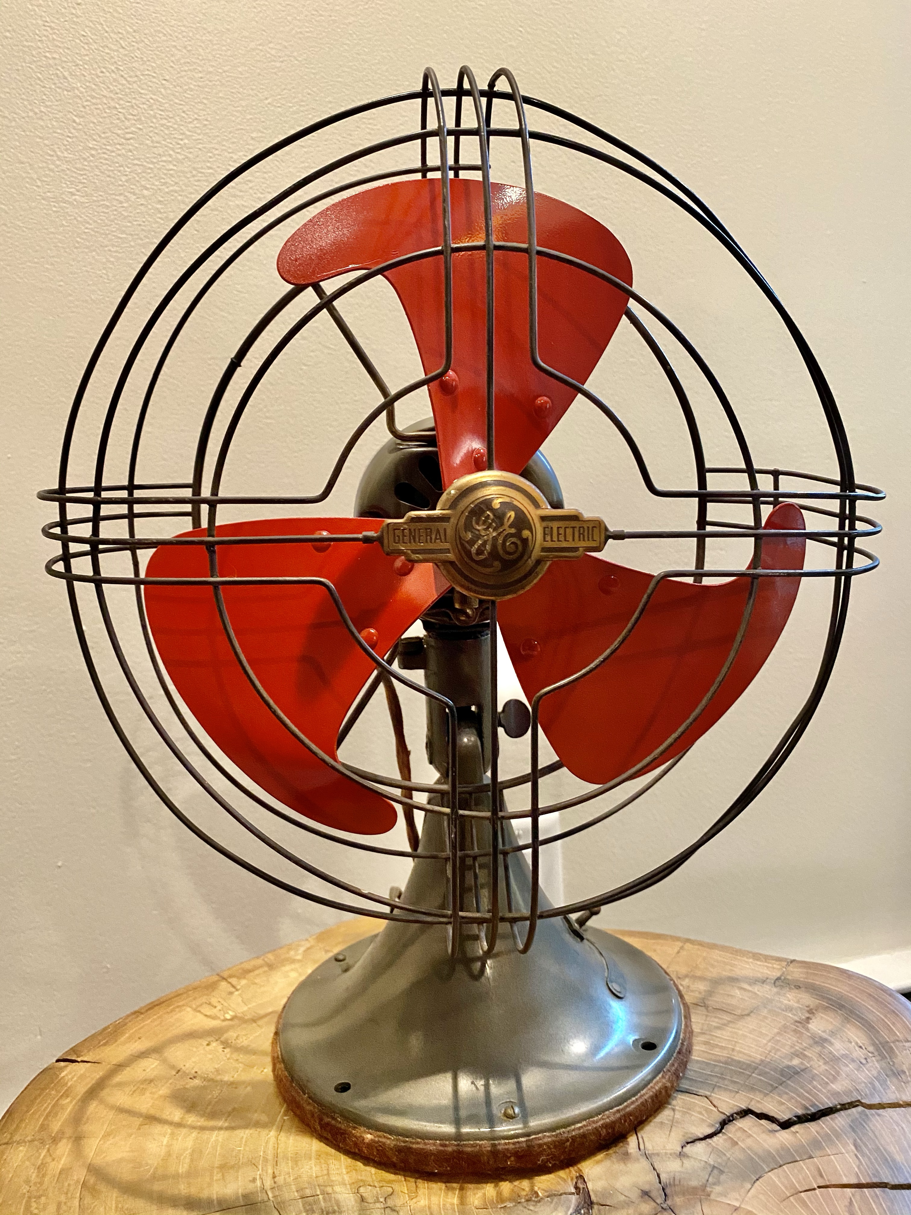I restored this GE fan from 1947 (or so). It was pretty beat up and the paint on the blades was worn. It works well except for the oscillation mechanism. Not safe for a house with kids..